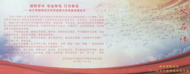 2018年11月15日,全体2018级学历科学型硕士研究生在会计学院研究生科学道德与学风建设倡议签名墙上郑重签上姓名,宣誓践行学术诚信,宣告入学系列学术道德规范教育圆满收官。