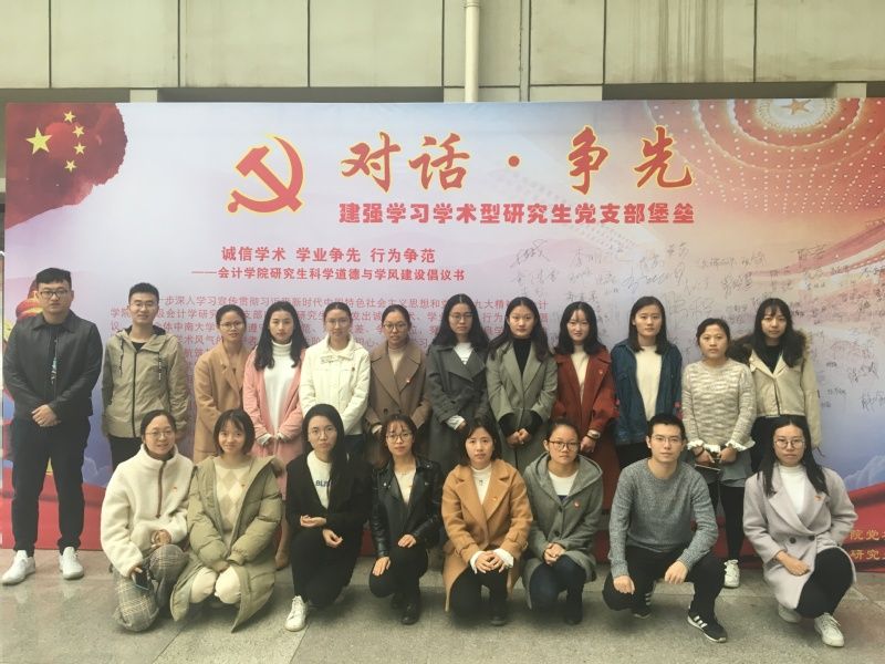 12月4日上午,随着“对话师长,明争先路径”子活动的落幕,会计学院2018级会计学研究生党支部“对话•争先”特色品牌创建系列活动正式宣告收官,自2018年10月立项以来,党支部以品牌创建为契机,以“对话•争先——建强学习学术型研究生党支部堡垒”为主题,以“坚守学术诚信、弘扬优良学风”和“对标找差、争先进位”为立足点,发挥学院师生在学术科研和学习学风方面典型人物和典型事迹的思想引领作用,将党支部建设与研究生学习相结合,将建设学习学术型党组织与增强研究生党员的党性修养相结合,通过“对话”的五大主题活动,强化学术诚信,共建“比学赶超”的优良学风。