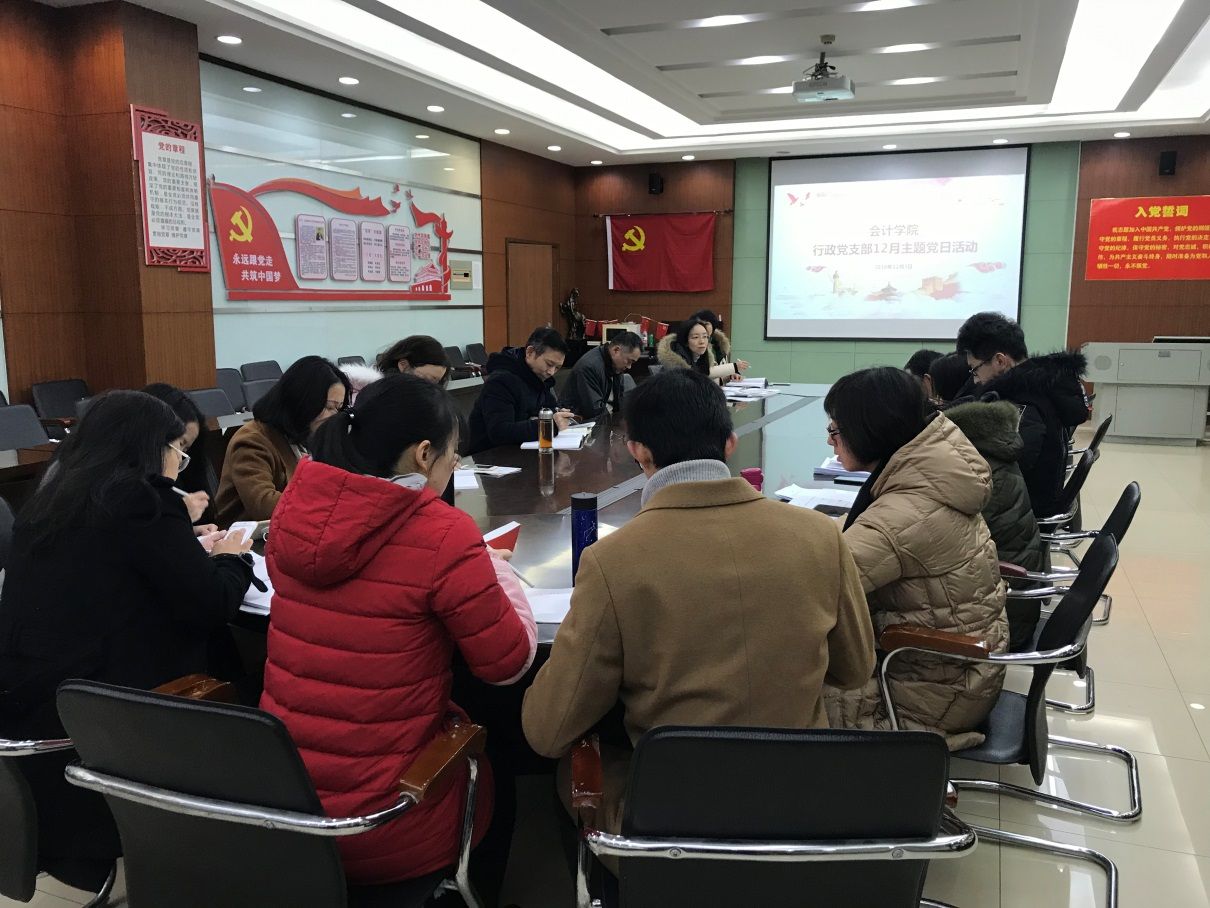 2018年12月7日上午9:00,会计学院行政党支部在文泉南401会议室召开十二月份支部主题党日活动,会议由支部书记王芹同志主持,院党委书记肖翠祥、及行政党支部的党员同志们参会。