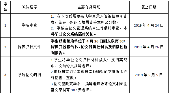 鉴于2019届本科毕业工作已经接近尾声,为了进一步适应论文管理工作要求,毕业论文需进行纸质版归档入库,具体工作安排如下:
