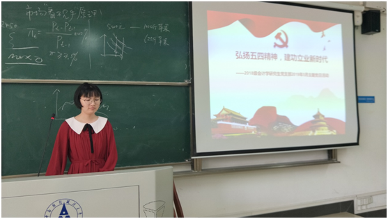 2019年5月9日, 2018级会计学研究生党支部在文添楼303开展5月主题党日活动。活动以“弘扬五四精神,建功立业新时代”为主题,由党支部副书记梁含嫣同志主持。
