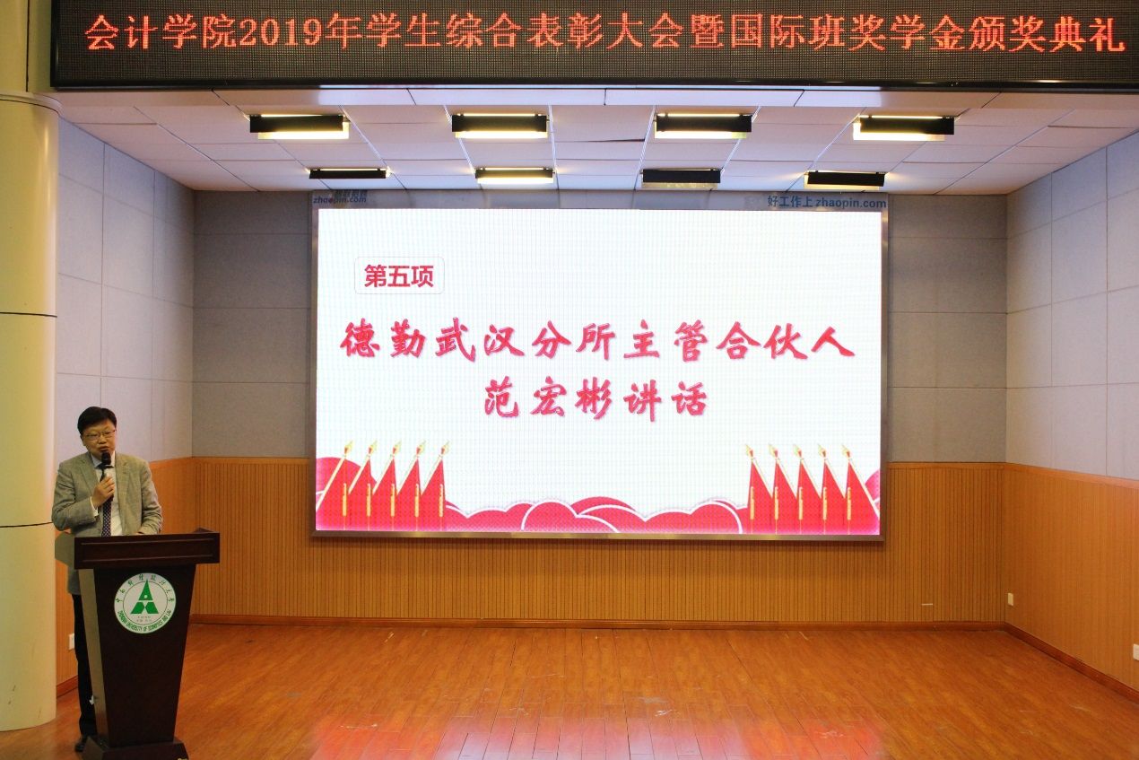 接下来是德勤华永会计师事务所武汉分所主管合伙人范宏彬先生发言。范先生在讲话中特别提到价值与诚信,鼓励大家设置目标,在未来职业生涯中诚信为本,努力实现自我价值与社会价值。