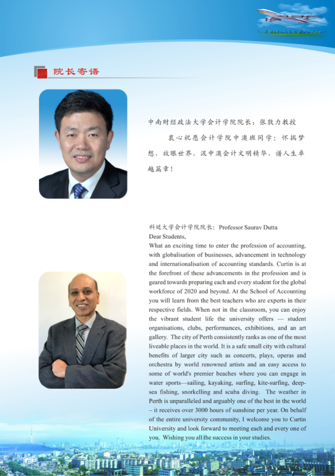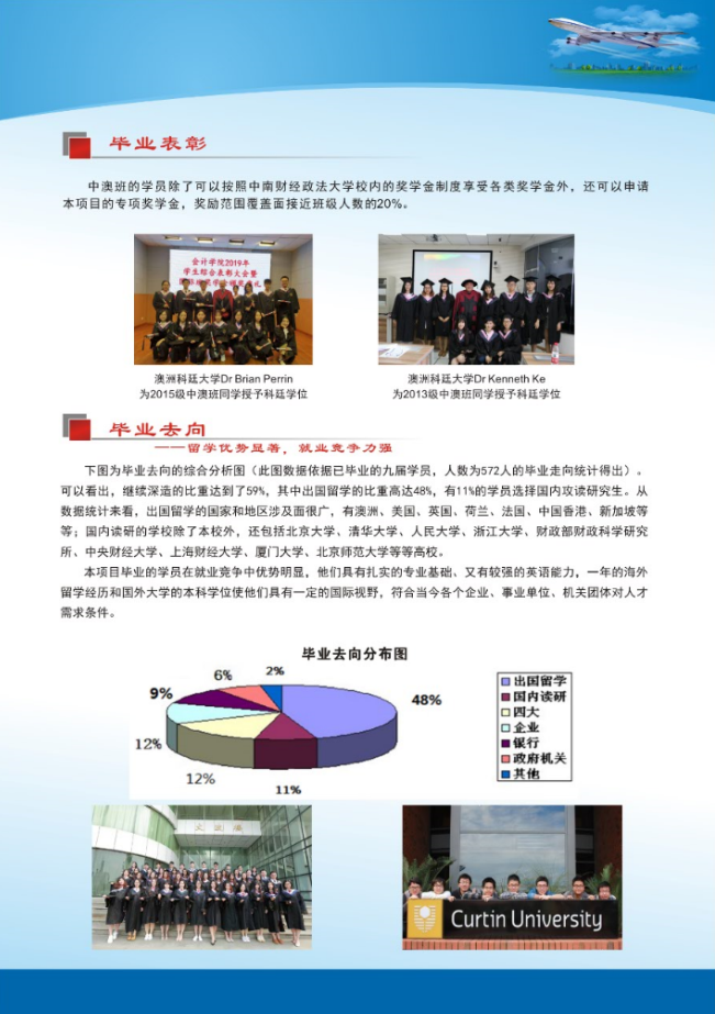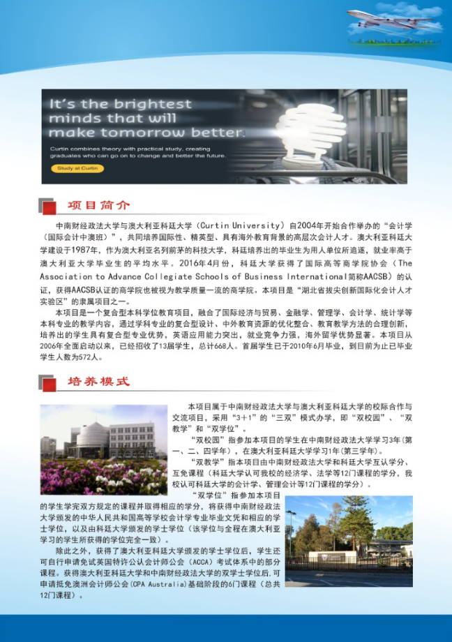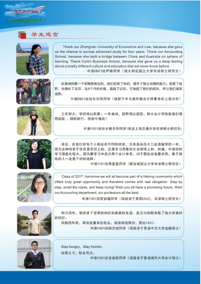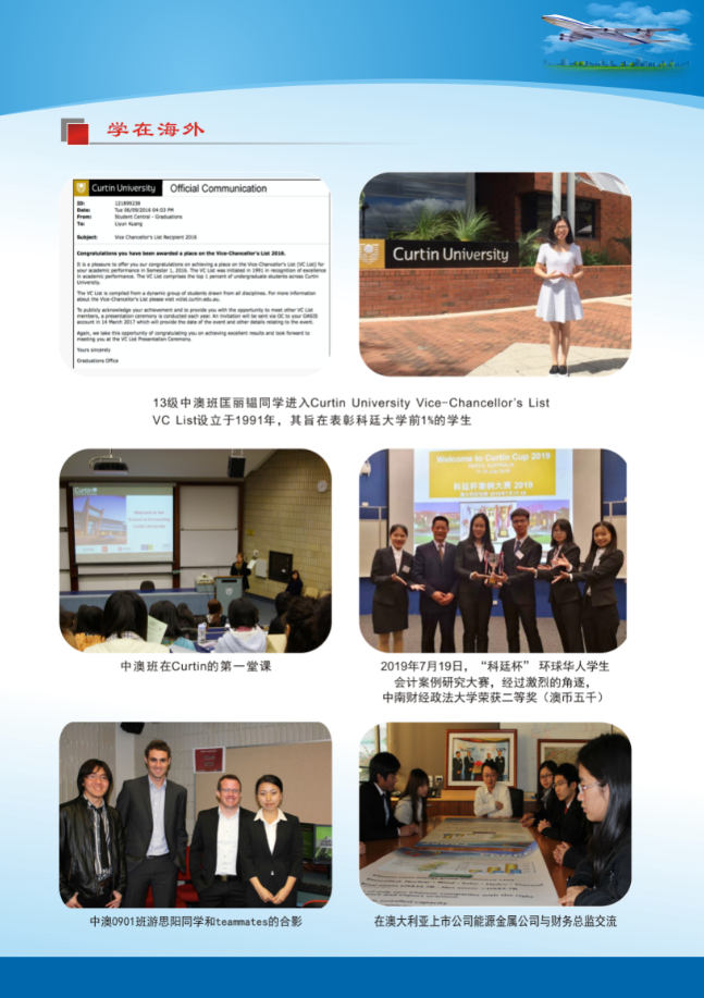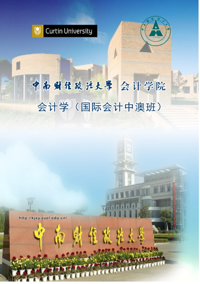 中南财经政法大学与澳大利亚科廷大学(Curtin University)自2004年开始合作举办的“会计学(国际会计中澳班)”(以下简称国会中澳班),共同培养国际性、精英型、具有海外教育背景的高层次会计人才。现在全校新生中招收“会计学——国际会计中澳班”学员。
