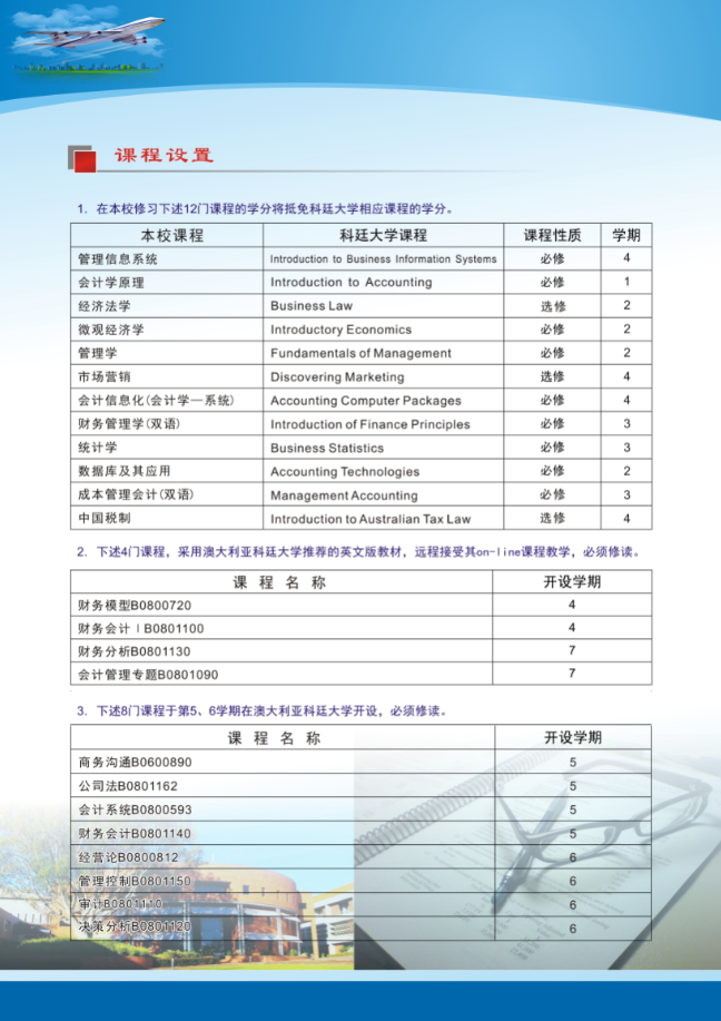 “双教学”指本项目由中南财经政法大学和科廷大学互认学分、互免课程(科廷大学认可我校的会计学原理、经济法学等12门课程的学分,我校认可科廷大学的财务会计、审计等12门课程的学分)。