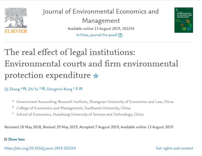 近日,由中南财经政法大学政府会计研究所的张琦教授(第一作者)、郁智博士(第二作者)和孔东民教授(通讯作者)合作撰写的学术论文“The Real Effect of Legal Institutions: Environmental Courts and Firm Environmental Protection Expenditure”被Journal of Environmental Economics and Management(JEEM)接受发表。