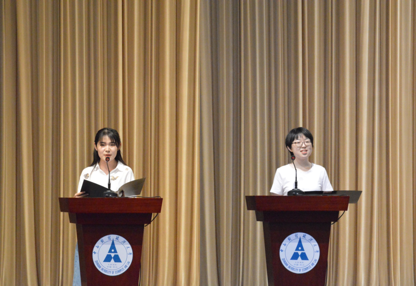 接下来,会计学院学生会主席杜亚东作为老生代表发言。杜亚东从师姐的角度,强调了提前规划与行动实践的重要性。她鼓励同学们勤奋学习,执着地去追求属于自己的那份“热爱”。会计1904班赵思源作为新生代表发言,她用饱含激情的话语号召同学们沉稳脚步,自强不息,追寻精彩丰富的大学生活。