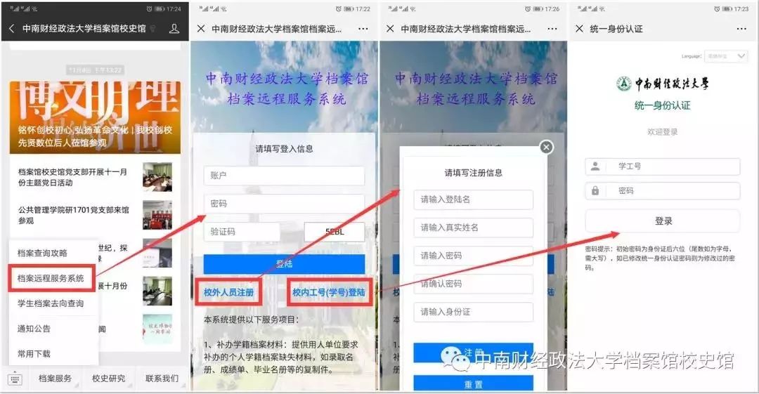关注微信公众号“中南财经政法大学档案馆校史馆”,打开公众号菜单栏中“档案服务”,选择“档案远程服务系统”,输入账户和密码登录。