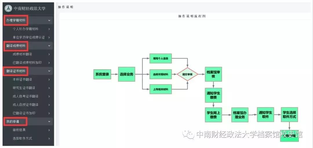 登录系统后,按照所需办理业务选择“办理学籍材料——个人补办学籍材料”或“办理学籍材料——单位学历学位成绩认证”。如下图所示,在填写基本信息、选择所需材料和上传相关材料后,提交审核,在“我的申请”功能区查看审核结果;审核通过后进行在线(微信)缴费,并选择取件方式(快递到付或现场自取)完成业务办理。