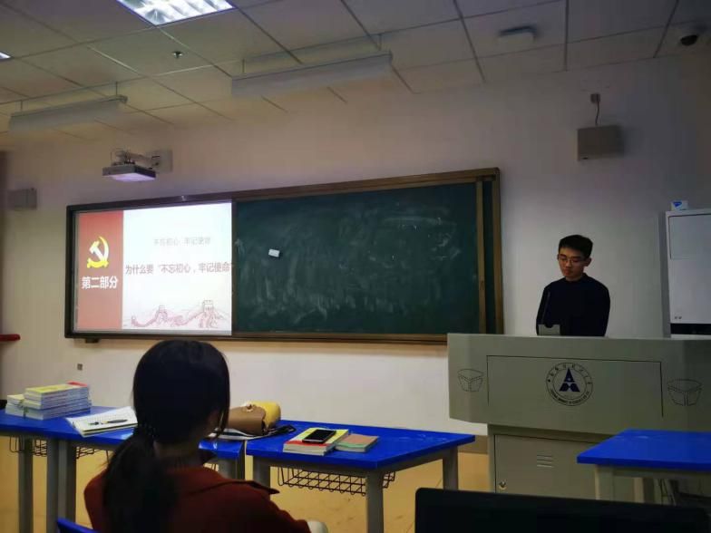 在支部书记讲党课环节,党支部书记周孜潜同志以《不忘初心 牢记使命 走好新时代长征路》主题讲党课,学习围绕什么是党的“初心”和“使命”、为什么要““不忘初心、牢记使命””和如何才能““不忘初心、牢记使命””展开,全体党员同志认真学习并积极参与讨论。在结合自身实际谈作为新时代的研究生应该怎么做时,周孜潜结合当下热门的《主持人大赛》节目,播放了三段演讲,希望青年研究生党员能够做到“坚守岗位”、“心系他人”、“传承优秀民族精神”,走好新时代的长征路。