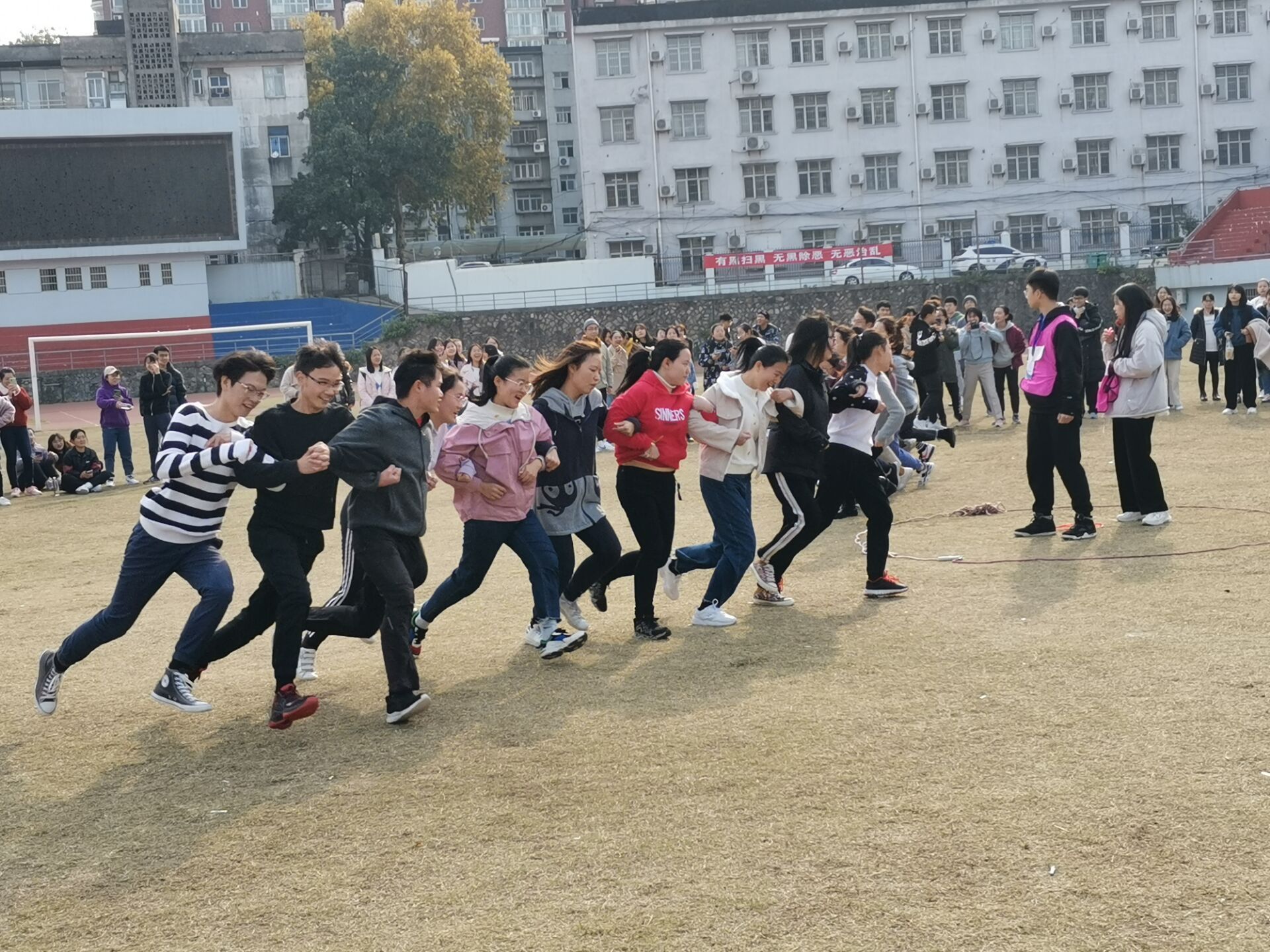 本次运动会,旨在营造趣味横生的氛围,分别设立了“爱的魔力转圈圈”、“跳长绳”、“诺亚方舟”和“拔河”四项团体项目。冬日的下午,阳光正好,虽则时有冷风相伴,但会院学子的热情却分毫不减,每一项项目都融汇着所有人的全力付出,每一个角落,都伴随着每个人的爽朗笑声。