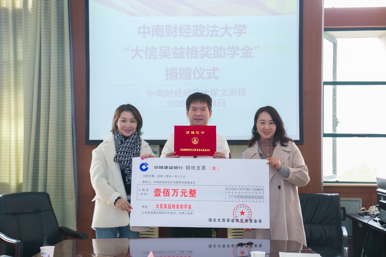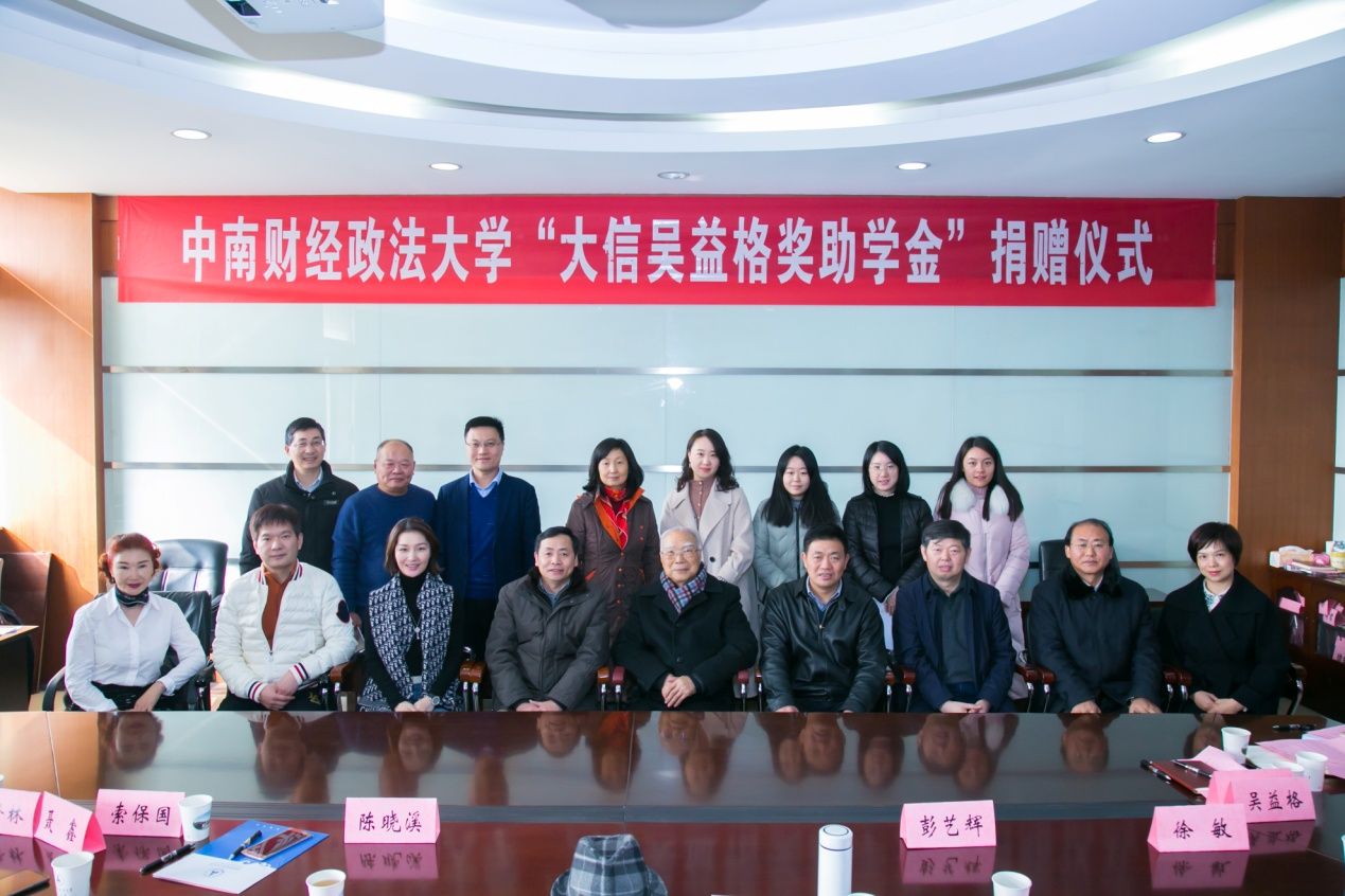(通讯员 赵侃)2020年1月14日,湖北大信吴益格公益慈善基金会向我校捐赠100万元,设立“大信吴益格奖助学金”,捐赠仪式在我校举行。大信会计师事务所创始合伙人、湖北大信吴益格公益慈善基金创办人、党支部书记吴益格先生,基金会理事长陈晓溪女士、执行理事长彭艺辉先生、荣誉理事索保国先生、荣誉理事马娟女士、党支部副书记吴新生先生、合伙人徐敏女士一行赴我校参加了仪式,中南财经政法大学校友工作与社会合作部部长、教育发展基金会秘书长聂鑫,副部长、副秘书长万莉及会计学院院长张敦力、院党委书记殷修林、院党委副书记王延、副院长王昌锐、副书记兼行政副院长徐会超等参会。会议由张敦力院长主持。