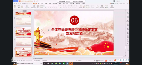 支部书记刘妙同志带领支部全体党员重温入党誓词,诵读和学习党章第五章;随后,刘妙同志结合2020年4月15日是我国第五个全民国家安全教育日的契机,带领党员深入学习习近平新时代中国特色社会主义思想三十讲第二十三讲《坚持总体国家安全观》,播放新华网的课件视频,党员们深刻认识到总体国家安全观的战略性、前瞻性、科学性和巨大的理论力量。