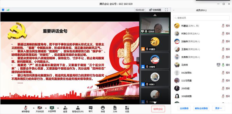 宅家上课,如何实现学业、论文“突围”?实习暂停,培养方案会否调整?开学延期,宿舍退费、消杀安排?求职将启,2021届秋招前路……5月21日晚7点30分,会计学院(会硕中心)线上召开2019级审硕5月主题党日(扩大)会议暨年级大会,在规定动作之外,特邀王昌锐副院长讲授《后疫情时期的学业新挑战》主题党课,由研办(中心)老师为同学们开展主题辅导与答疑,为2019级审硕学子消除疑虑、提振信心,浇灌思想情绪的“稳定剂”,吹响学业进击的“冲锋号”。