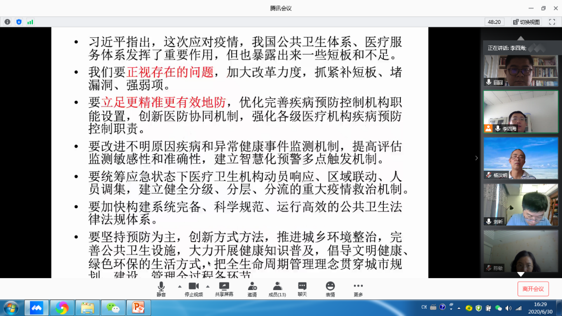在此基础上,李四海书记以“为党育人践初心,为国育才承师道”为主题讲党课。党课中,大家进一步学习了《习近平给北京大学援鄂医疗队全体“90 后” 党员的回信》《习近平寄语新时代青年强调 坚定理想信念站稳人民立场 练就过硬本领投身强国伟业》等资料,结合当下的一些关于师德师风的新闻热点问题展开了热烈的讨论。最后,李四海书记总结了疫情期间本支部工作经验,并布置下一阶段的常态化防疫工作。