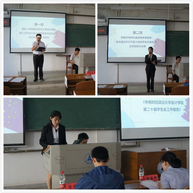 大会第四项,会计学院学生会主席杜亚东宣读《中南财经政法大学会计学院第二十届学生会工作报告》。报告共分为两部分:对年度工作的回顾总结与对未来工作的思考展望。院学生会积极推动权益和服务型组织的建设,注重思想引领与改革创新,将对内改革与对外联系紧密结合,稳步推进学院组织架构的精简完善与体制机制的优化升级,在思想引领、组织建设、新媒体建设、生活权益、学术交流、创业联络、文体活动、学生社团等诸领域做出了积极的探索与改良。而在今后的工作中,院学生会将继续加强思想引领,深化改革,优化体系,立足于服务学生与维护学生权益的工作基础,培养更多的学生骨干,创新活动与工作的开展方式。