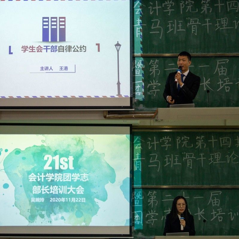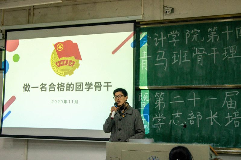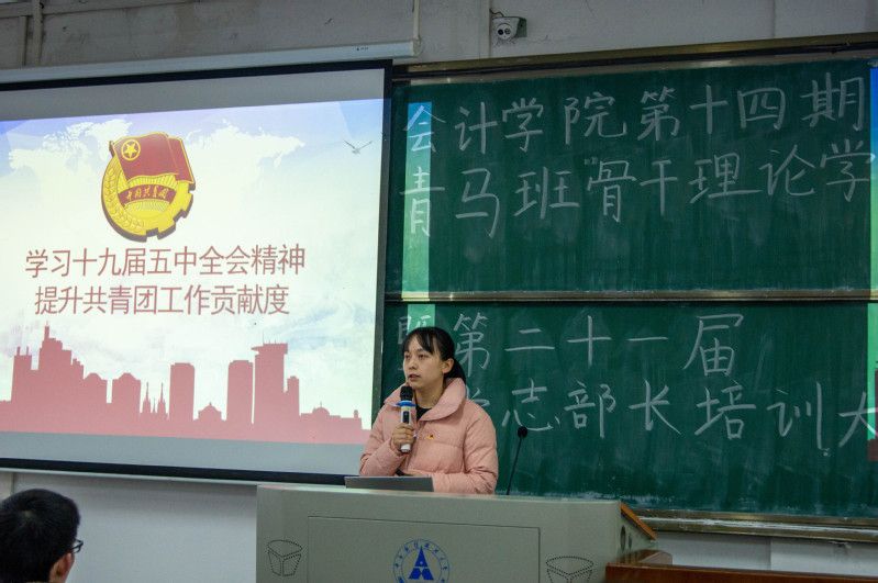 授旗仪式结束后,张昭妍老师宣布会计学院第十四期“青马班”骨干理论学习暨第二十一届团学志部长培训大会正式开始。两位老师分别为我院团学骨干讲授团课。张昭妍老师以“学习十九届五中全会精神,提升共青团工作贡献度”为 题,带领大家一起学习了十九届五中全会精神,并讲述了新时代共青团工作中“引领力”“组织力”“服务力”三力协同的作用及意义。在谈及我院共青团工作时,张老师明确提出在开展工作时要注重“思想认同度”、“基层活跃度”和“学生满意度”,并再次强调了宣传思想引领工作的内容和要求。