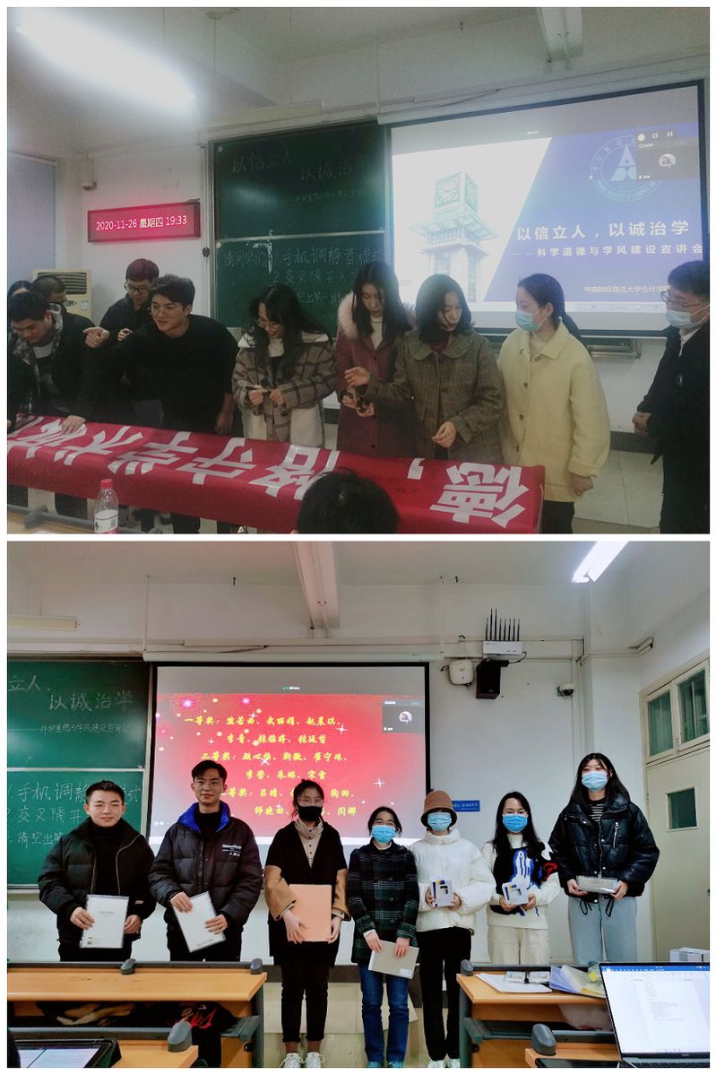 2020年11月26日晚7点30分,由中南财经政法大学校研究生院、党委研究生工作部和校研究生会主办,会计学院承办的“科学道德与学风建设宣讲教育”活动在文添楼209教室成功举办。本次活动以“以信立人,以诚治学”为主题,学院近300名硕、博研究生以线下或线上形式参与了本次活动。