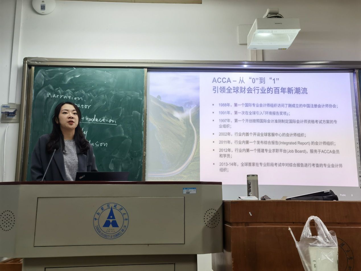 与此同时,本次见面会还邀请到了ACCA武汉代表处郭姝经理。郭姝老师为同学们介绍了ACCA在全球的发展与概况,让同学们更加深刻地了解到ACCA的价值和作用。