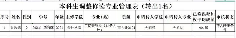 根据《中南财经政法大学本科生调整修读专业管理办法(修订)》(中南大教字【2021】34号)文件精神、《会计学院本科生调整修读专业(类)实施细则》和教务部《关于做好2021级普通本科学生调整修读专业(类)工作的通知》经审核,我院以下学生符合申请调整修读专业的要求,现予以公示。公示时间为2022年2月27日-3月1日。如有异议,请于2022年3月1日12:00点前将复议申请以书面形式交到文泉楼南307(会计学院教学办)。