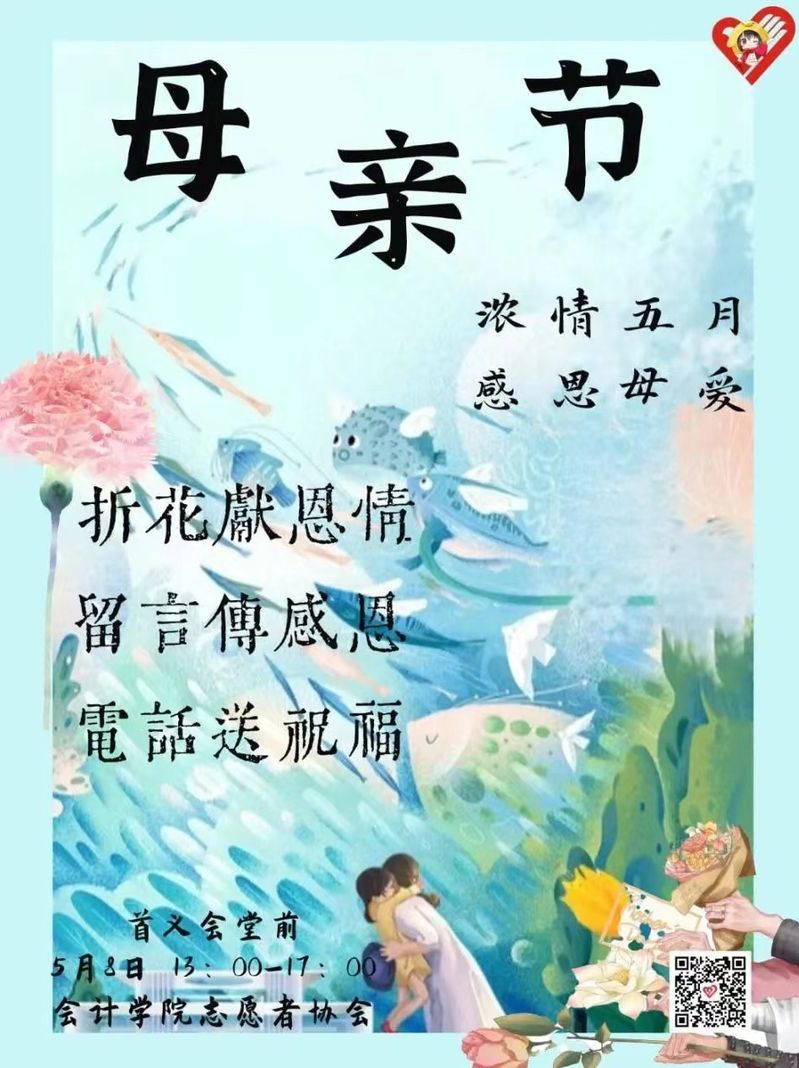 5月8日,正值一年一度的母亲节,会计学院志愿者协会秉承“会传爱心,计予奉献”的服务宗旨,在首义校区开展“浓情五月,感恩母爱”志愿活动,为同学们提供平台和机会,让大家通过“折花献恩情”、“留言传感恩”、“电话送祝福”等方式,敞开心扉,袒露心声,向母亲表达自己的感激和爱意。(文/图 杨蓦)