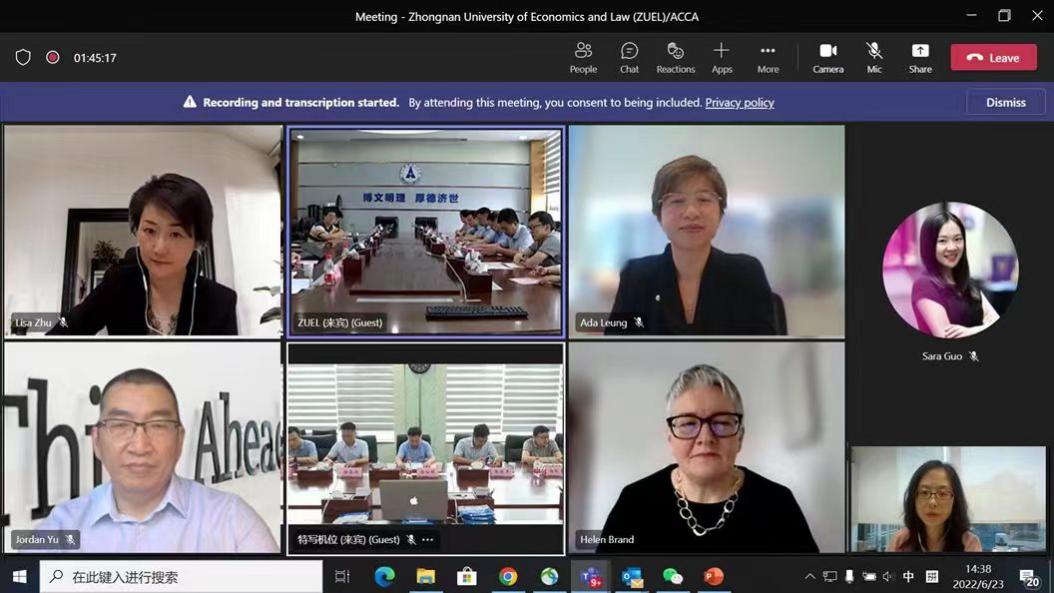 (通讯员:廖莎 刘东晓) 6月23日下午,中南财经政法大学与英国特许公认会计师公会(The Association of Chartered Certified Accountants,简称ACCA)在中原楼五楼会议室就一流国际会计人才培养进行了线上会晤。校党委副书记、校长杨灿明,ACCA行政总裁白容(Helen Brand),会计学院院长张敦力、院党委副书记徐会超、副院长冉明东、院党委副书记胡桂锬、ACCA中国总监梁淑屏、中国内地事务总监于翔天、华中区总监朱晓云等出席会议。会议由ACCA华中区总监朱晓云主持。