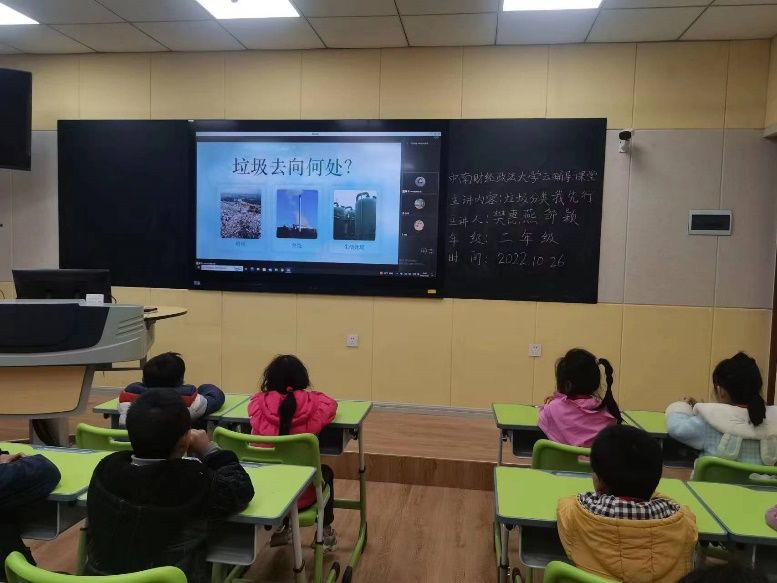 之后,邹颖同志向同学们详细科普了如何进行垃圾分类,分别介绍了可回收垃圾、湿垃圾、干垃圾和有害垃圾,并抛出了一个个问题启发同学们思考,“大棒骨是厨余垃圾吗”、“创可贴是有害垃圾吗”、“电子产品是有害垃圾吗”......同学们你一言我一语,纷纷给出自己的答案,课堂十分活跃。最后,邹颖同志教导同学们学会在校园里进行垃圾分类,以一首童谣将课堂气氛带向高潮,课堂最后在一段有趣的科普小视频中结束。