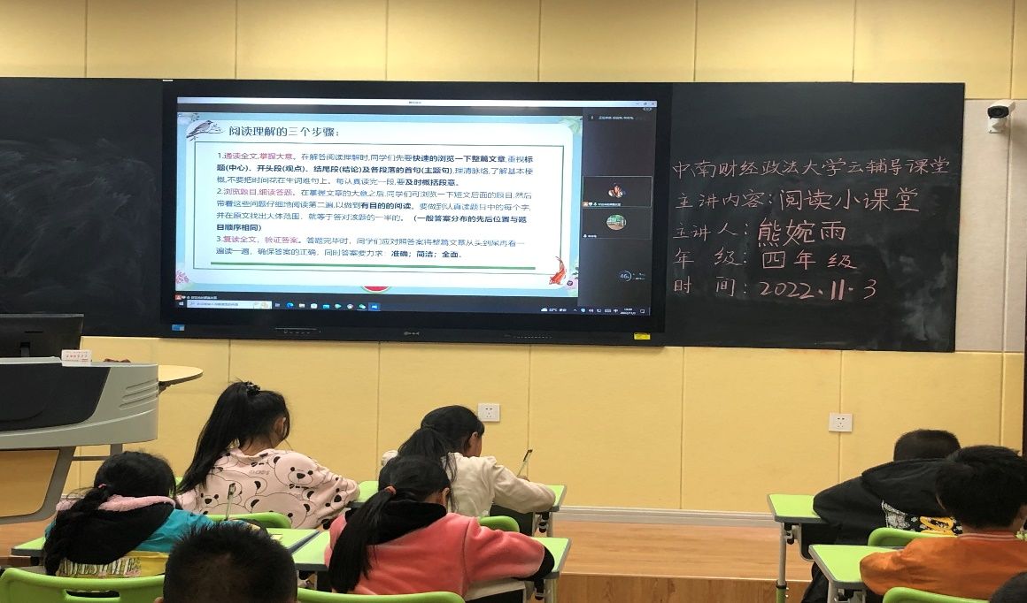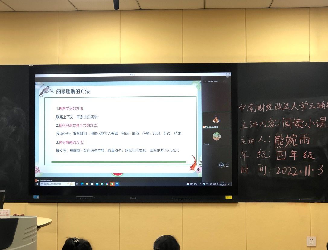 (通讯员 熊婉雨)2022年11月3日下午,通过腾讯会议平台,会计学院学生党员志愿服务团成员为云南省盐津县箭坝小学四年级师生开展了“阅读小课堂”的“云课堂”教学活动,旨在帮助学生提炼阅读步骤,总结阅读方法,养成良好的阅读习惯。此次课程由学生党员熊婉雨主讲,箭坝小学校长李勇、四年级班主任万玉凯老师及四年级全体学生参加了本次活动。