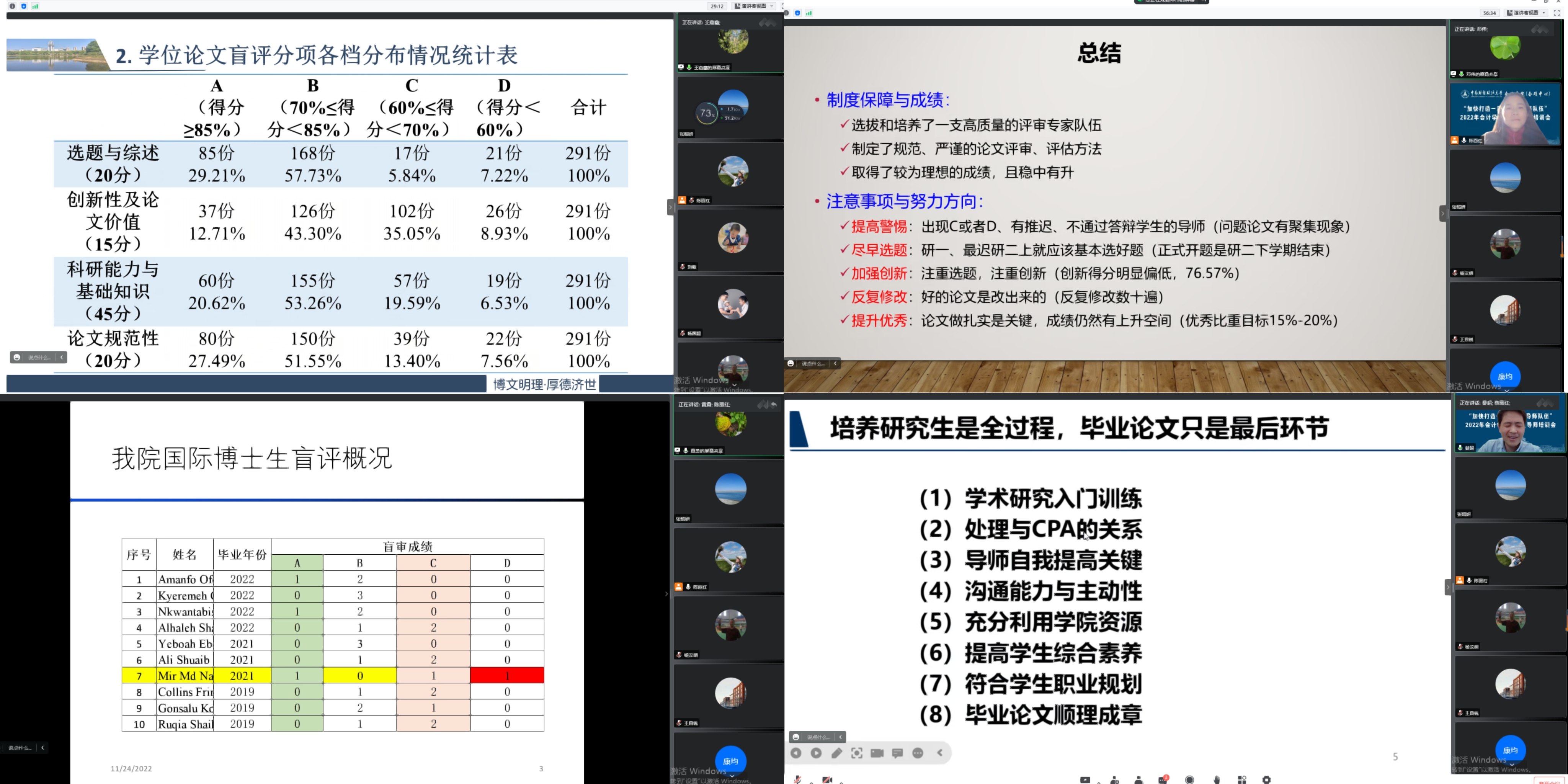 为深入学习贯彻党的二十大精神,贯彻落实习近平总书记对研究生教育工作的重要指示精神和全国研究生教育大会精神,根据学校研究生导师培训工作的通知和学院研究生导师队伍建设的总体安排,11月24日下午2点半,会计学院全体研究生导师和青年教师齐聚云端,召开“加快打造一流研究生导师队伍”2022年会计学院研究生导师培训会。本次培训会由会计学院副院长陈丽红教授主持。学院全体研究生导师和35岁以下非研究生导师参加了此次会议。