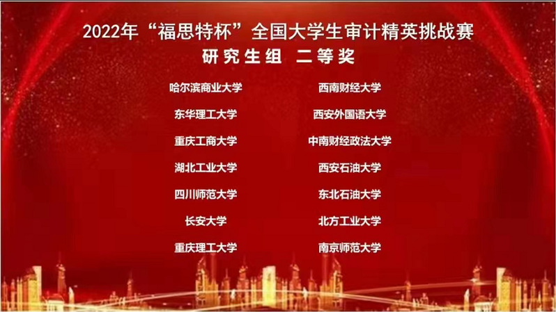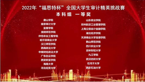(图文:张姿颖 审核:朱昭威)2022年11月26日,由中国审计学会审计教育分会主办,南京审计大学政府审计学院承办的2022年“福思特杯”全国大学生审计精英挑战赛通过线上形式举办。来自西南财经大学、南京审计大学、广东外语外贸大学等多家高校共计390支队伍参加了此次比赛,经过两个半小时的激烈角逐,我院张姿颖、吕芷琪、任家颐三名同学组成的本科生代表队获得全国一等奖的佳绩;郭志斌、朱昭威、叶雅萌三名同学组成的研究生代表队获得全国二等奖的佳绩;王嘉鑫老师获得“优秀指导老师奖”。