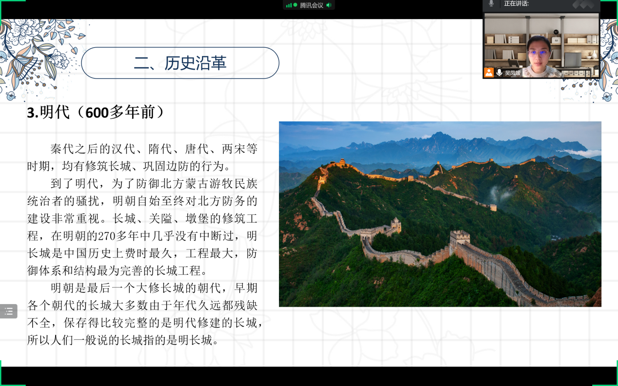 紧接着,吴凤媛老师带领同学们学习了长城的历史价值和意义。万里长城是我国古代一项最伟大的工程,它反映了我国古代劳动人民的高度智慧和惊人毅力,也反映了我国古代建筑技术的伟大成就。长城凝聚了中华民族自强不息的奋斗精神和众志成城、坚韧不屈的爱国情怀,已经成为中华民族的代表性符号和中华文明的重要象征。最后借此机会,吴凤媛老师也对同学们以后的学习和未来的追求提出了一些建议。