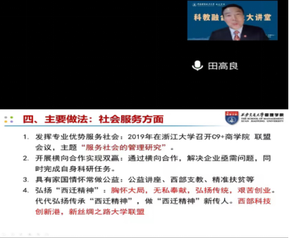 为进一步加强我院研究型人才的培养能力,完善学术交流机制,提高学生对于知识和技能的应用与实践,增进学科各领域之间的联系,2022年12月19日晚上19:00,会计学院第九期科教融合育人大讲堂在云端隆重开讲。我院诚挚邀请西安交通大学管理学院副院长、管理学博士、博士生导师田高良教授作为主讲嘉宾,以“数智时代会计学术研究探索”为主题,面向会计学院师生作了一场高水平的学术讲座。本场讲座由会计学院院长张敦力和副院长陈丽红教授共同主持,300余名硕博研究生及教师学者参加了本次讲座。
