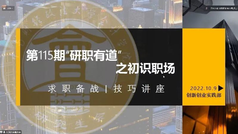 2022年10月9日19:00,会计学院研究生会成功承办第115期“研职有道”之初识职场——求职备战&技巧讲座。本次讲座特邀思成求职的孔翔老师作为主讲人,分享研究生阶段的求职规划和面试经验。