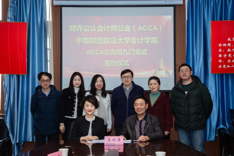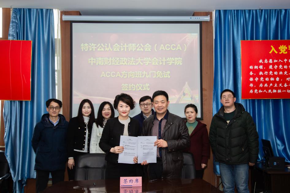 中南财经政法大学会计学院与ACCA自1994年开始合作,于2005年正式开设ACCA方向班。该班采用“ACCA体系”、“双教学”和“多证书”的合作与交流模式办学。2005年首届ACCA班成立以来,已经累计招收ACCA方向学生1076人。2014和2018年,中南财经政法大学会计学院先后获得ACCA“黄金级”、“白金级”认可培训机构资格。