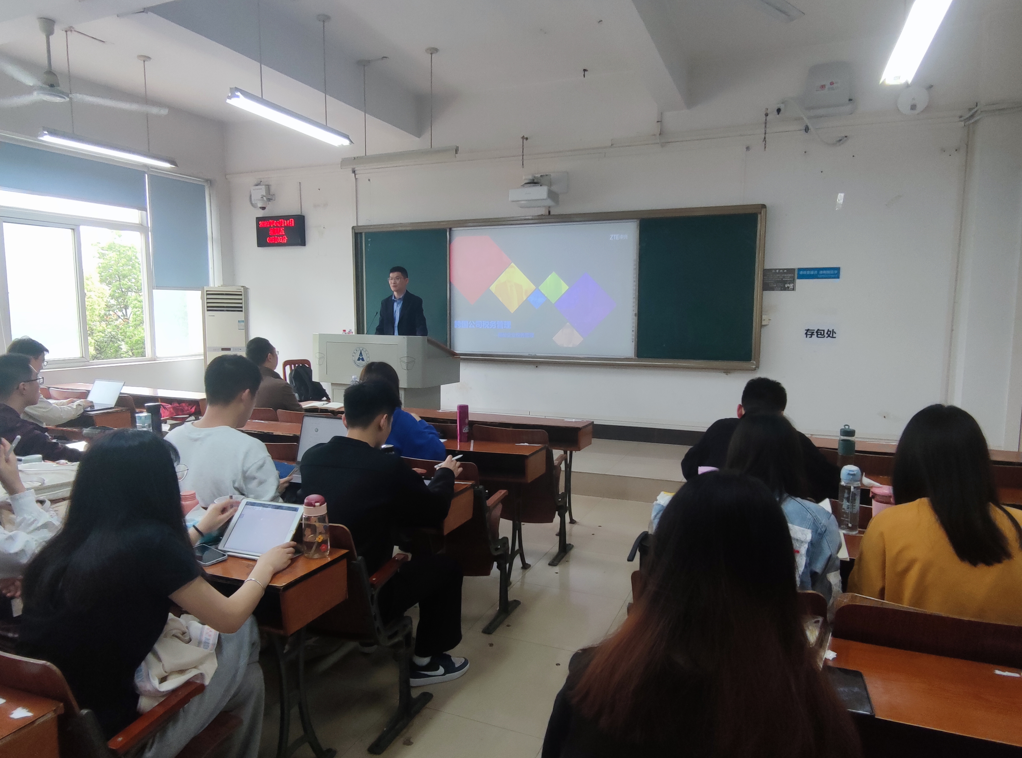 为促进同学们对行业发展趋势、前沿问题等有更深层次的了解,拓宽视野,增强专业素养和就业竞争力,4月14日上午,中兴通讯全球税务总监解文伟先生应邀在文添楼208为《财会审前沿问题研究》课程的同学们进行授课。本次课程由专硕导师组组长季华副教授主持,主题为“跨国公司税务管理—揭秘企业税务管理”。
