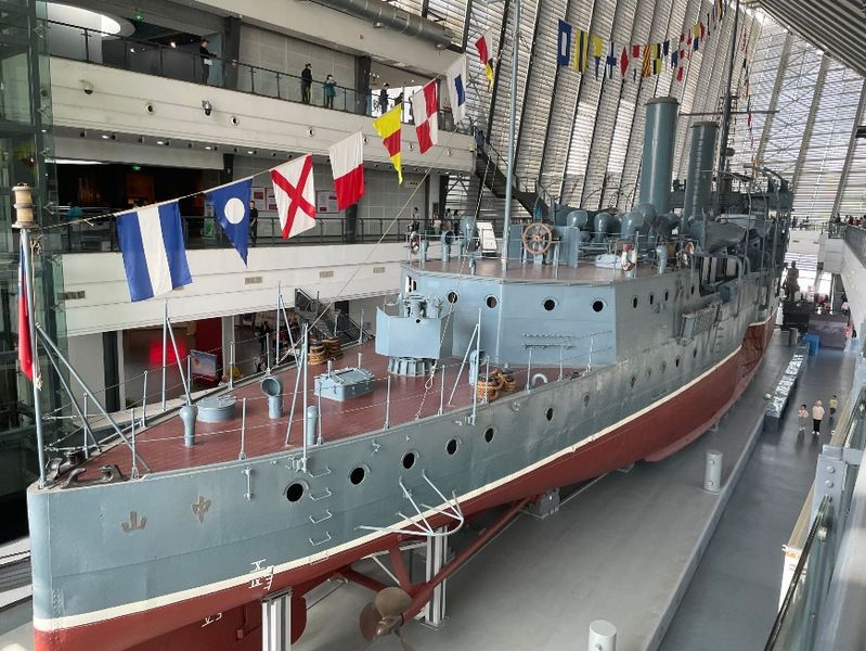中山舰博物馆整体分为上、中、下三层。博物馆第一层展示着中山舰,它安静地屹立着,无声地向我们诉说着它所经历过的那段动荡岁月。在博物馆二楼和三楼,大家参观了从中山舰打捞出水的各类文物,包括铭牌标志、舰载设施、生活用品、武器装备等,它们从不同角度反映了中山舰在各个历史时期的政治、军事、经济、文化等社会活动及该舰官兵们的精神面貌。