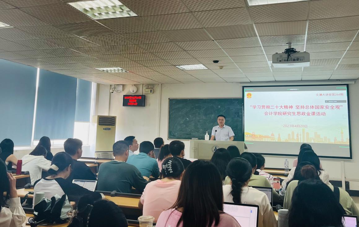 4月20日下午,由会计学院承办的第264期“文澜大讲堂”暨新时代研究生思政金课在文添楼501顺利举行。全国国防教育专业委员会委员、全国国防教育联盟理事会理事、我校军事教研室主任胡万松副教授为我院研究生做了主题为学习贯彻二十大精神,坚持总体国家安全观的报告。会计学院党委副书记、纪委书记兼行政副院长徐会超出席活动并致辞。活动由会计学院研究生工作办公室主任张昭妍主持。