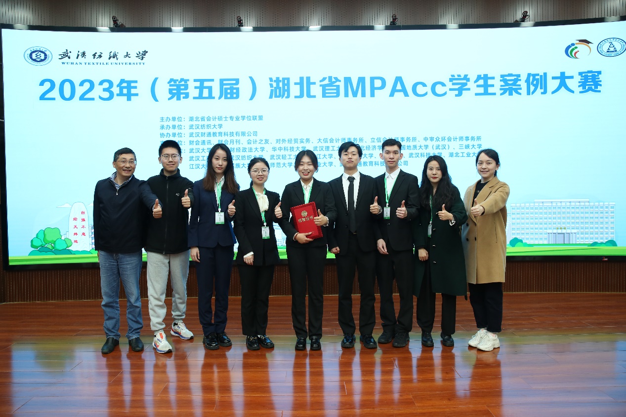 2023年4月22日至23日,2023年湖北省第五届MPAcc学生案例大赛复赛和决赛在武汉纺织大学举行。在张敦力院长、殷修林书记的正确领导,会硕中心主任兼副院长王昌锐的统筹安排,以及会计硕士导师组的指导下,由我院(中心)2022级会计硕士研究生史慧颖、刘亚倩、张瀚月、陈成、田伟豪、郭志斌等6位同学组成的“超能六战队”在王嘉鑫副教授的直接指导下,获得2023年湖北省第五届MPAcc学生案例大赛冠军并实现五连冠。