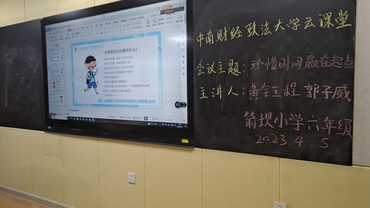(通讯员 郭子威和黄钰程)4月5日下午,会计学院学生党员志愿服务团成员为云南省盐津县箭坝小学六年级师生开展了以“珍惜时间”为主题的“云课堂”教学活动。此次课程通过腾讯会议,由学生郭子威和黄钰程老师主讲。课程面向六年级全体学生,旨在为了让学生在临近小学毕业之际更加明白珍惜时间的重要性。