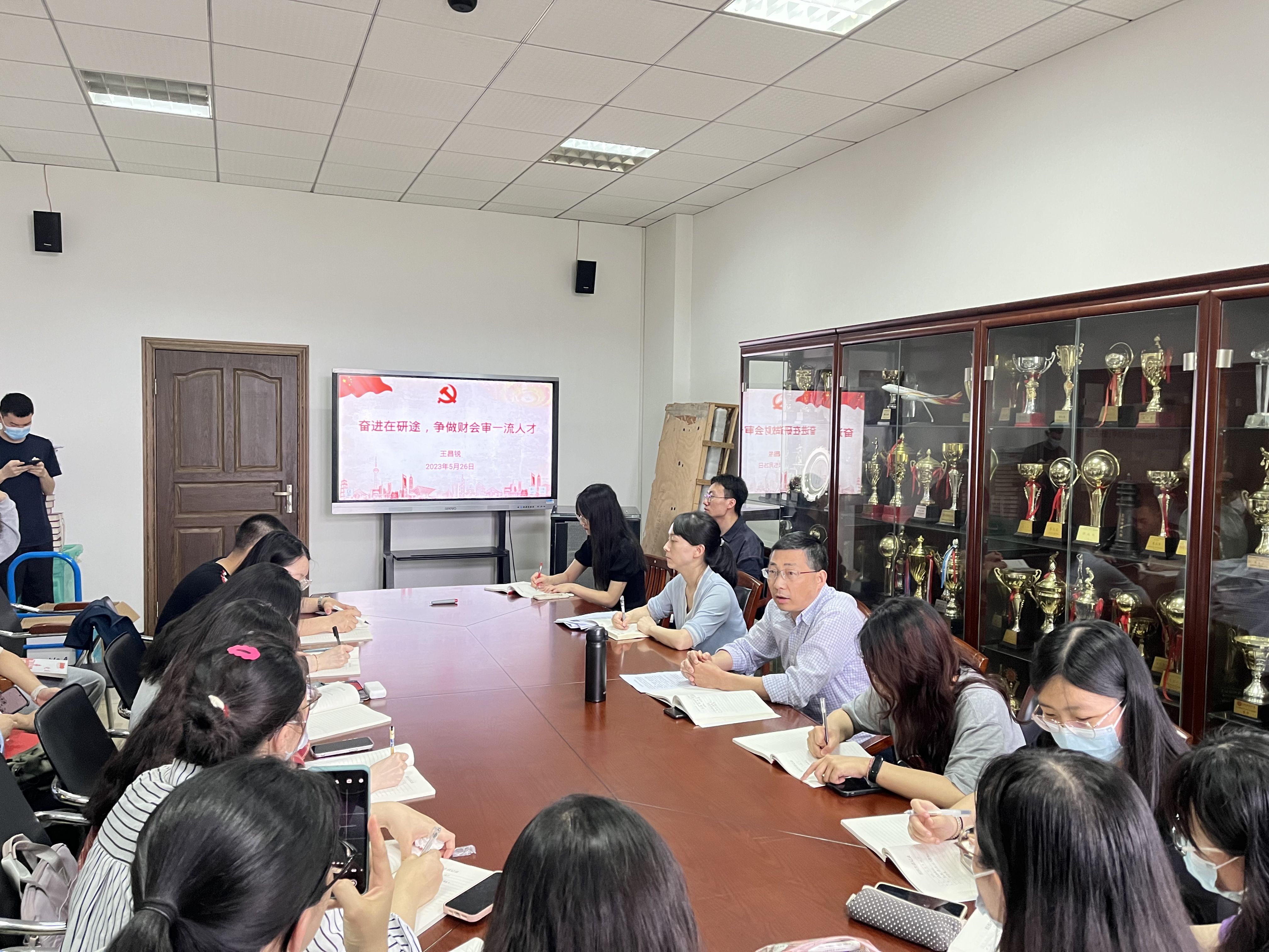 2023年5月26日中午,会计学院2022级会硕第一党支部于文泉楼南303会议室开展了主题为“凝心铸魂筑牢根本,锤炼品格强化忠诚”第二期“读·讲·行”暨5月份主题党日活动。院党委委员、会硕中心主任兼副院长王昌锐教授作为支部联系领导参与本次活动并作指导。活动由支部副书记田伟濠主持,会硕第一党支部全体党员同志参加了此次活动。