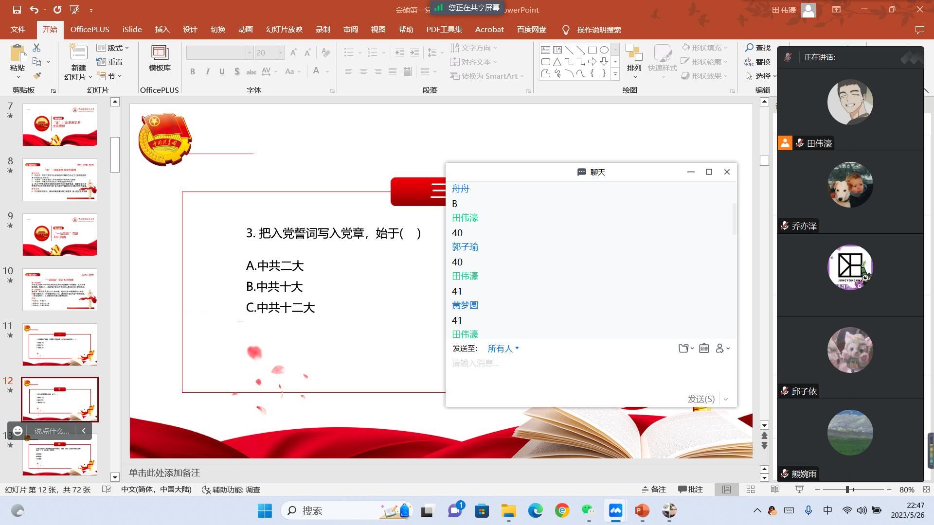 最后,支部开展了“一站到底”特色党建知识竞赛。竞赛共分为两轮,由线下与线上两种形式组成。支部成员首先对党史问卷进行作答,根据分数排名评选出前13名同志,进入第二轮比赛。第二轮比赛为线上抢答,支部成员在展现知识才能的同时,也对我党党史有了更深入地认识。(文/图 乔亦泽)