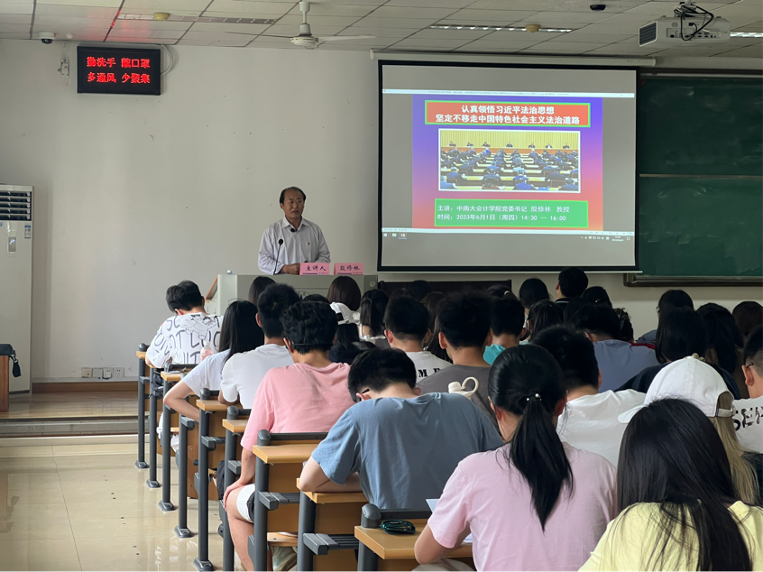 (通讯员 范纯琍、黎玥) 为进一步宣传党的二十大精神,推进学习贯彻习近平新时代中国特色社会主义思想走深走实,更好落实党的最新理论进教材、进课堂、进头脑。6月1日下午,会计学院党委书记殷修林教授在首义校区文润楼303教室与200多名会院学子“同上一堂思政课”,课程主题为《认真领悟习近平法治思想 坚定不移走中国特色社会主义法治道路》。中南财经政法大学学习贯彻习近平新时代中国特色社会主义思想主题教育督导组第三工作专班组长胡海南部长,组员卫瑾老师和会计学院辅导员参与此次思政课。此次思政课由会计学院辅导员范纯琍教授主持。