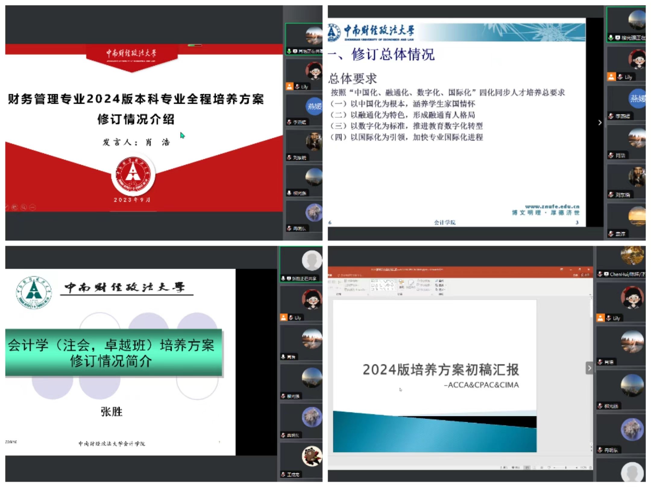 随后,会计系主任柳光强,财务系主任肖浩,审计系主任张胜,国际教育中心副主任陈辉分别从培养目标、毕业要求、课程设置等方面向与会专家汇报了会计学专业,财务管理专业,财务管理+人工智能双学位实验班,会计学注册会计师方向,会计学(荆楚卓越经管人才实验班),会计学(ACCA实验班),会计学(中南大-CPAC班)以及 财务管理专业—CIMA方向(中南大-SKEMA“3+2”)培养方案的修订情况。