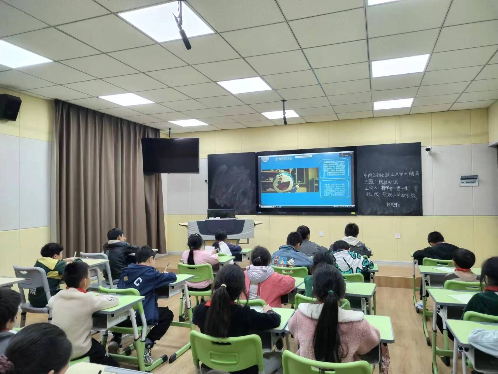 在开场环节,主讲人柳宇轩首先进行了自我介绍,并向四年级的小朋友们展示了目录。目录分为了“税收的由来、我们身边的税收、税收的分类、税收的用途四个部分”,涵盖了税法的基本内容框架。并通过一些互动行为拉近了与孩子们之间的距离,活跃了课堂气氛。