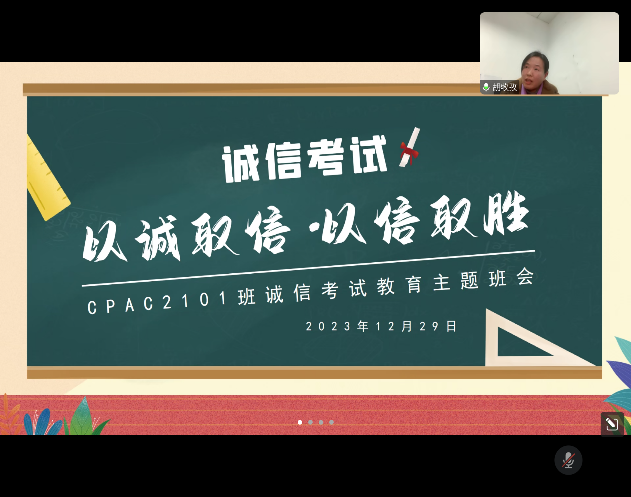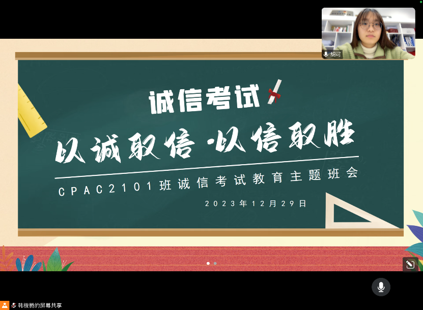 新闻网讯(学生通讯员:韩骏腾)为明确“无人监考”考场纪律,培养学生诚信意识,加强考风考纪宣传教育,营造积极向上的考试氛围, 12月28日下午,会计学院CPAC2101班于腾讯会议线上召开诚信考试教育主题班会,班级导师温倩老师、辅导员胡牧孜老师出席本次会议。