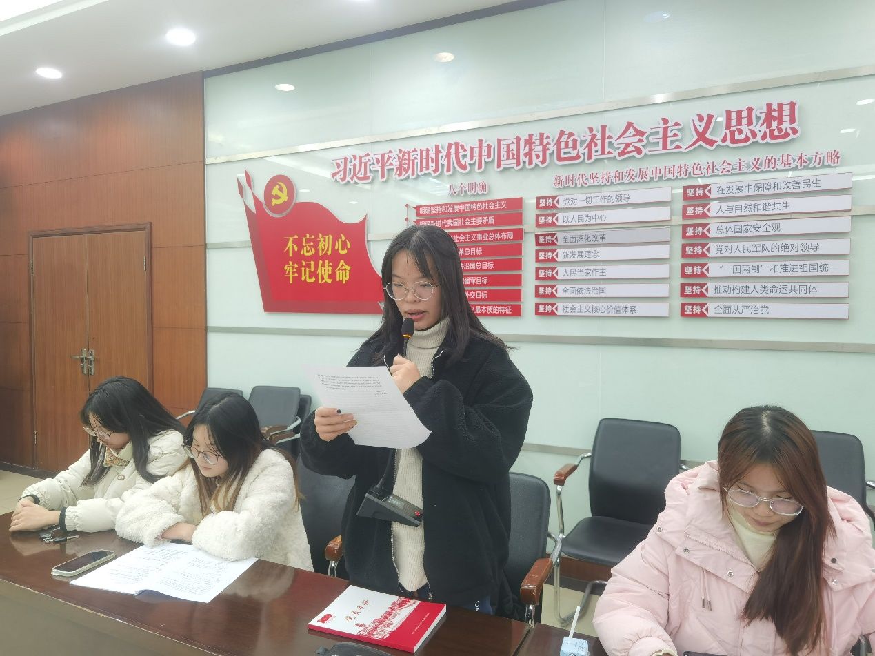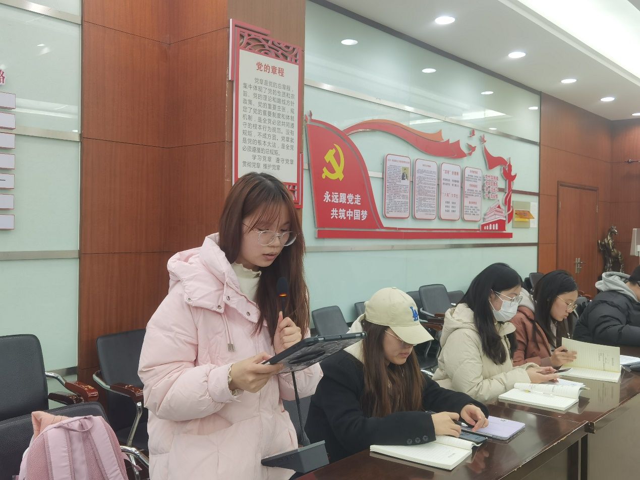 活动开始,党支部进行规定动作,现场交纳党费,重温入党誓词,坚定理想信念,“不忘初心、牢记使命”,勇毅前行。在领学环节中,钞宇轩同志带领大家学习《中央经济工作会议在北京举行 习近平发表重要讲话》。习近平总书记在讲话中全面总结2023年经济工作,深刻分析当前经济形式系统部署2024年经济工作。对我国经济的发展方向进行深入分析,对未来的发展道路指明方向;王宁馨同志带领大家学习《习近平:加强涉外法制建设 营造有利法制条件和外部环境》,强调加强我国涉外法制建设的重要性,健全我国法律体系,推动我国更高水平对外开放,更好应对外部风险挑战,为中国式现代化行稳致远营造有利法制条件和外部条件。