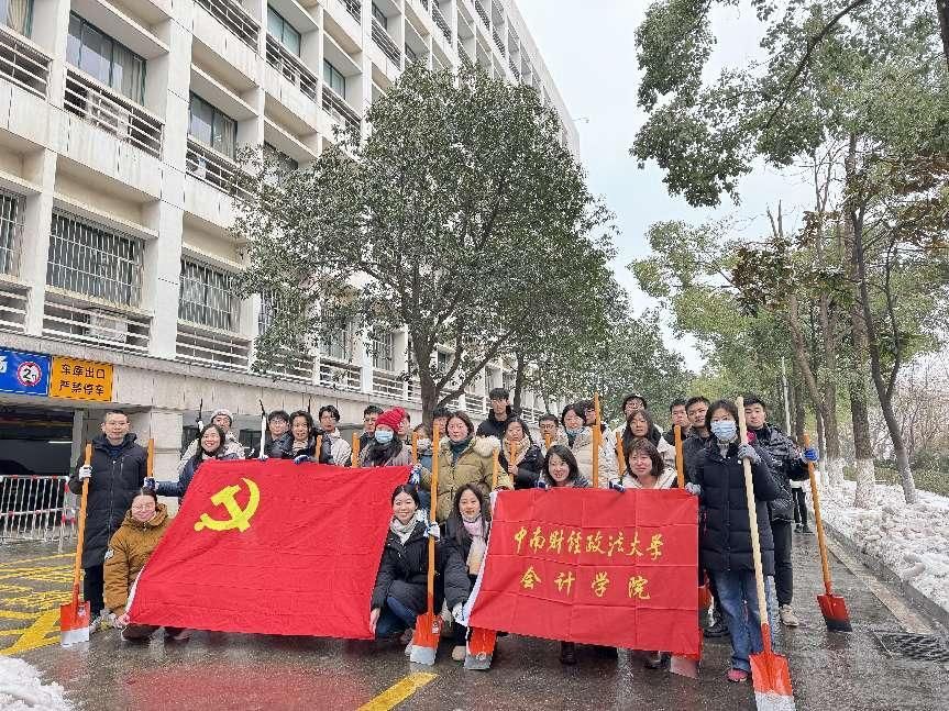 雪覆校园心不冷,师生铲雪护平安。会计学院师生将继续迎难而上、勇于担当,充分发挥先锋模范作用,让党旗在战冰雪、暖人心、保平安一线高高飘扬!