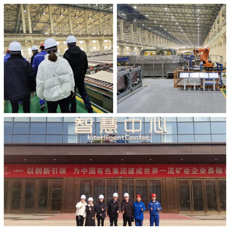 上午10时,我院(中心)师生一行4人到达位于湖北省黄石市阳新县的大冶有色金属集团控股有限公司的子公司阳新弘盛铜业有限公司,该公司的40万吨高纯阴极铜清洁生产项目是中色集团实施“321”发展战略、湖北省打造千亿有色金属产业的重点发展项目之一。该公司融入管理创新、流程再造、信息共享的新思维,以扁平化管理、大规模集控、无边界协同、大数据决策为目标,努力打造世界一流的低成本、高技术、高效益的绿色工厂、效益工厂、智能工厂。我院(中心)师生一行先后来到智慧中心、研发中心以及电解主厂房等区域,参观了解了智能工厂的整体布局、生产工艺流程、环保指标、智能化验系统以及智能化工厂建设情况。