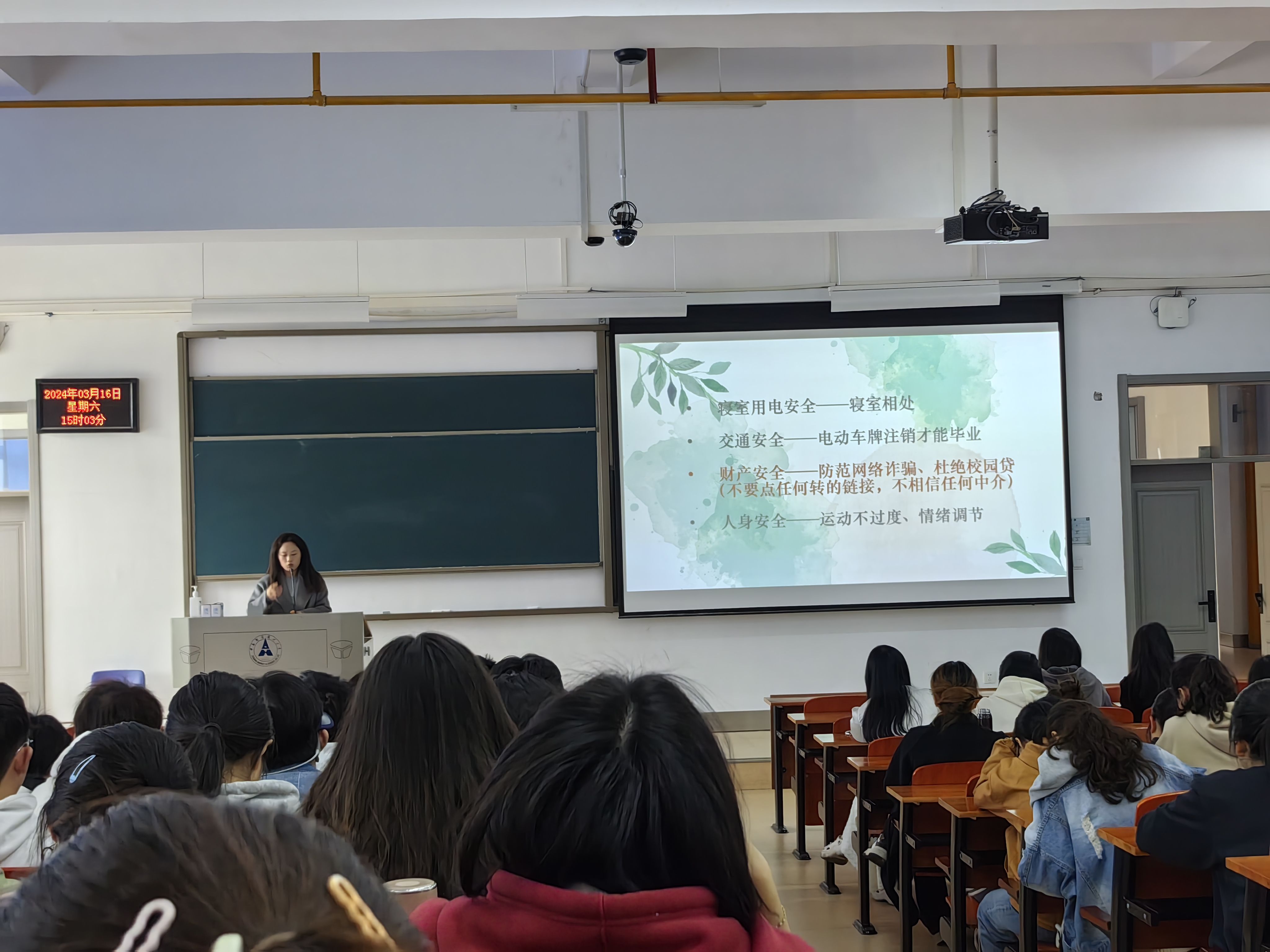 在最后的安全教育环节,黎老师通过播放四个安全教育视频,分别强调了防诈骗、防校园贷、用电安全和交通安全的重要性,并发放安全教育答卷,考查同学们现场观看安全教育视频的成效。