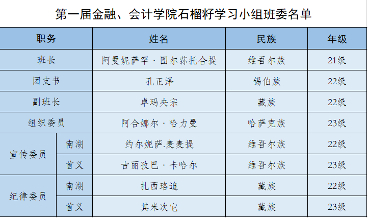 相信石榴籽班委将会一直秉持着“从学生中来,到学生中去”的工作原则,不断优化自我,为全体石榴籽学习小组成员提供更贴心的帮助与服务,让金融、会计的同学们“像石榴籽一样紧紧抱在一起”!