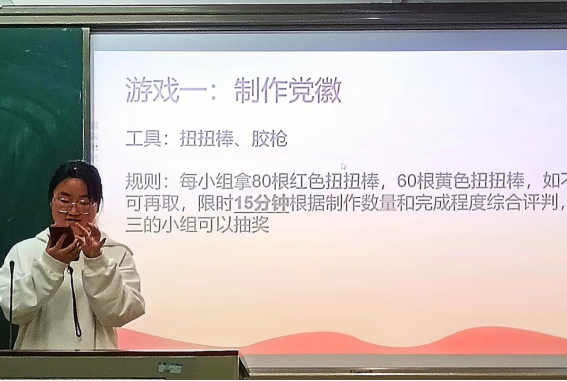 活动以“制作党徽”趣味小游戏展开。同学们手持扭扭棒,仔细比对,细心剪裁,在制作过程中将党徽细节牢牢刻在了心头。与此同时,主持人吴娉婷向大家介绍两会相关知识。通过系统学习历届两会的思想成果和实践成果,团员们丰富了对党的认知;通过深入了解2024年两会中“推动生态环境综合治理”“大力发展绿色低碳经济”“积极稳妥推进碳达峰碳中和”“建设人与自然和谐的美丽家园”等热点议题,团员们深刻体会到了保护生态、保障民生、利用科技手段助推生态治理的重要性。